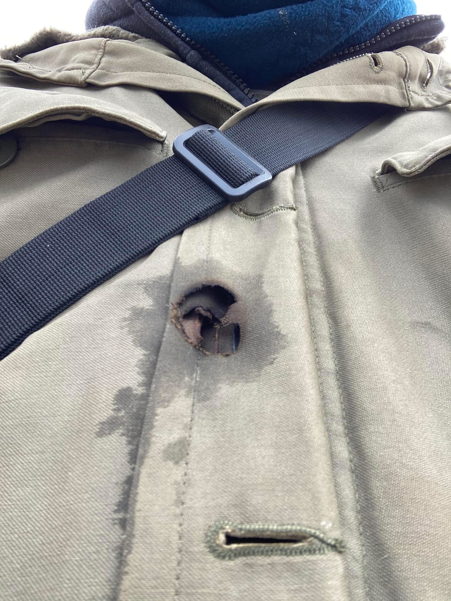 キレイな穴が開きましたが、軍服だったからこれで済んだのかもしれません。