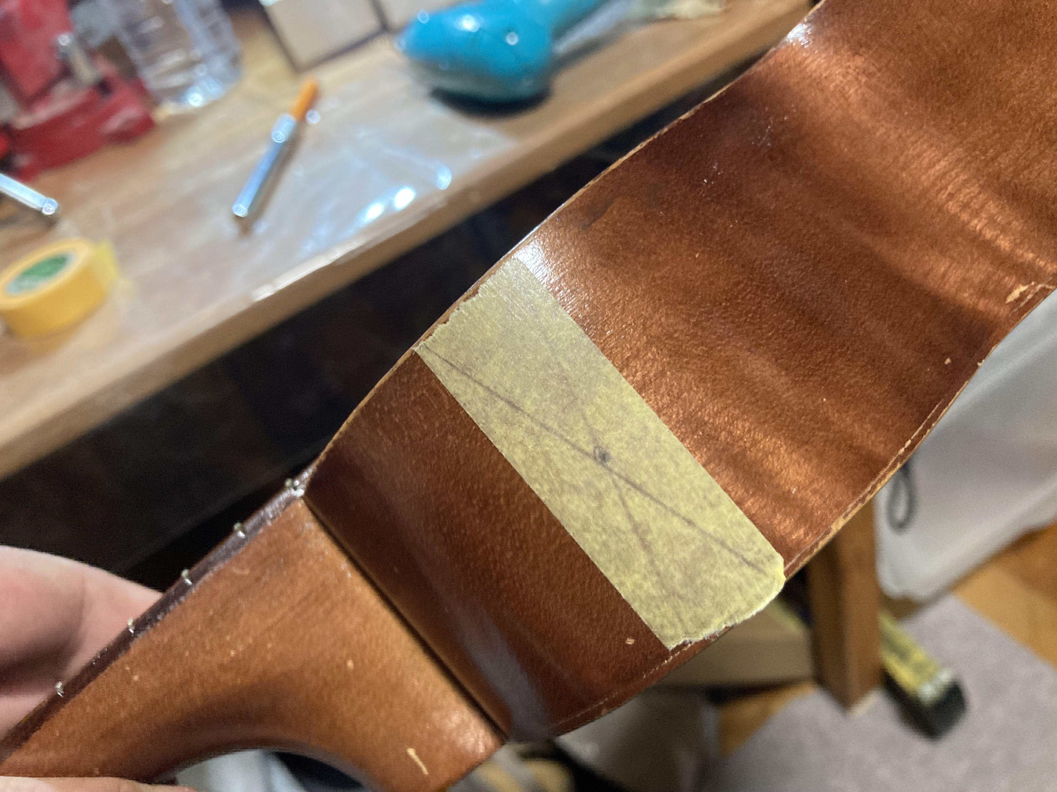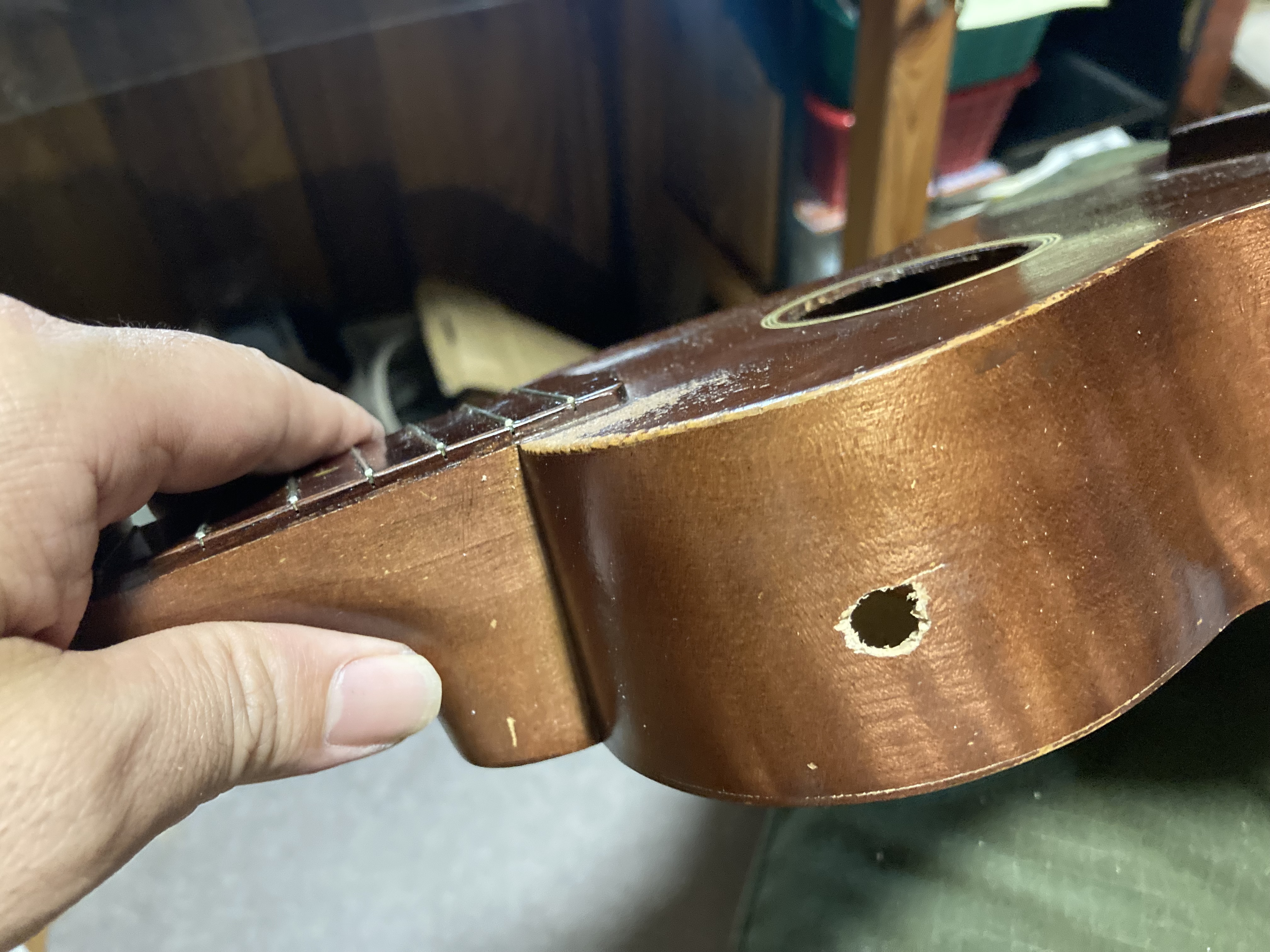 この後ばらして洗浄しておいたペグを取り付けてあとは弦を張るだけなんですが・・・・・