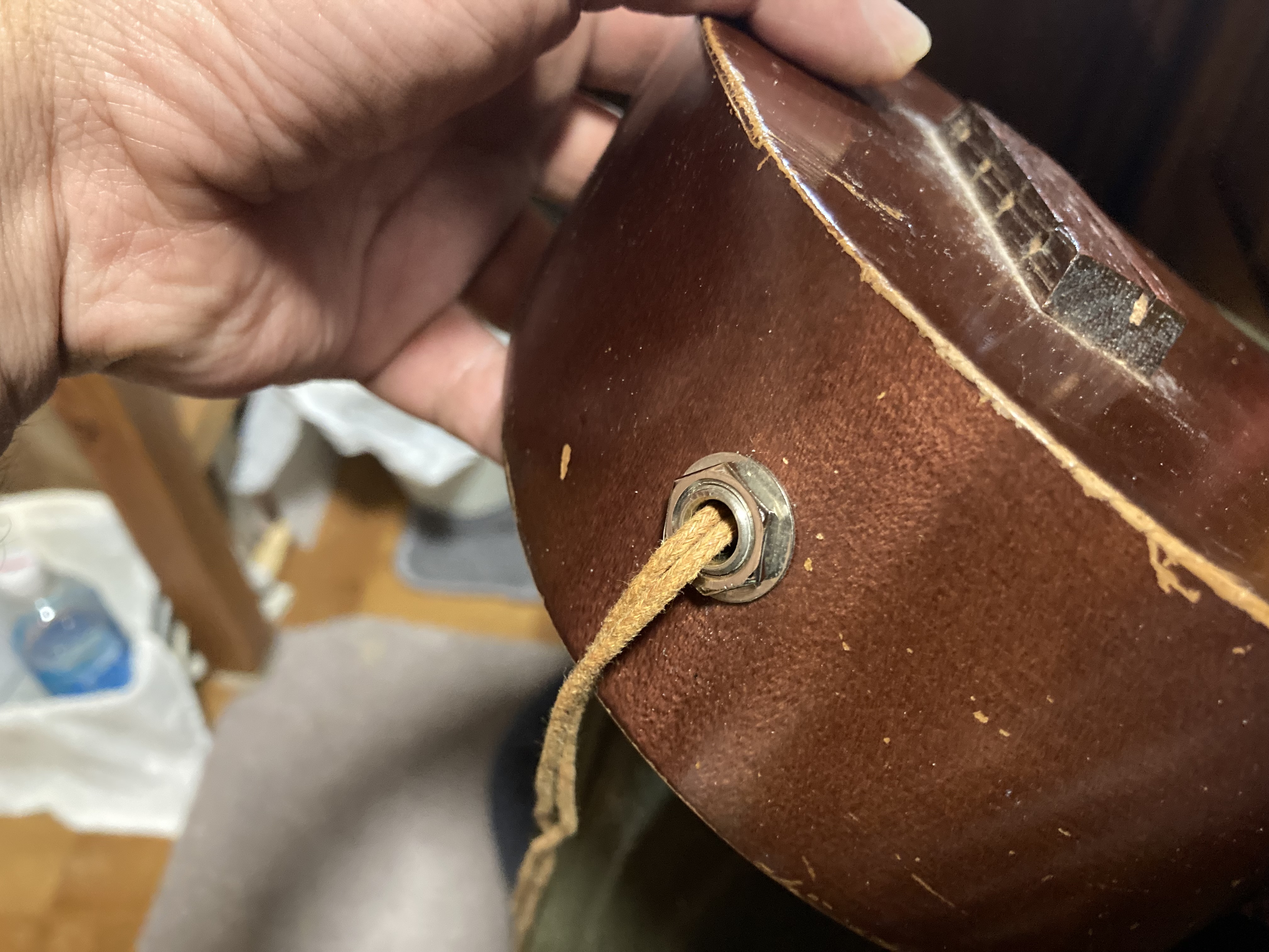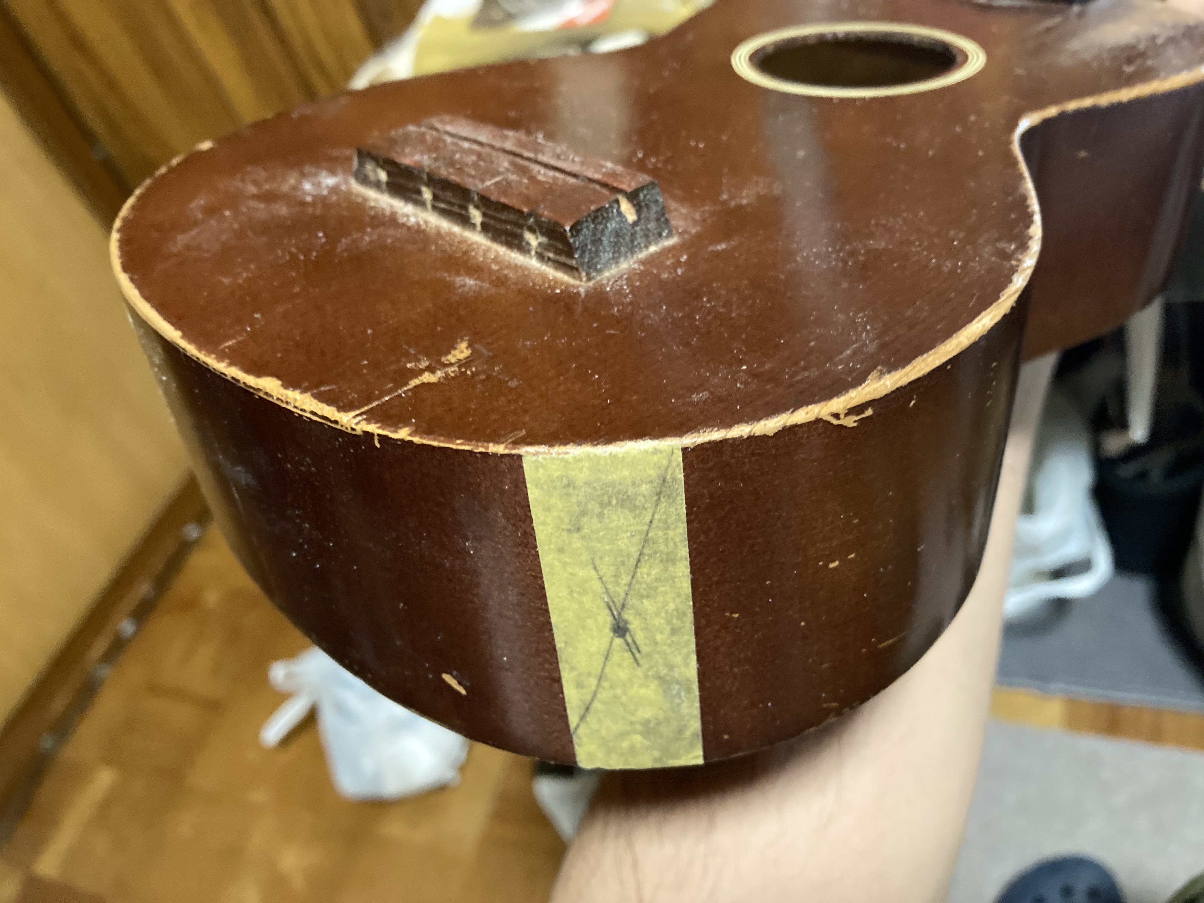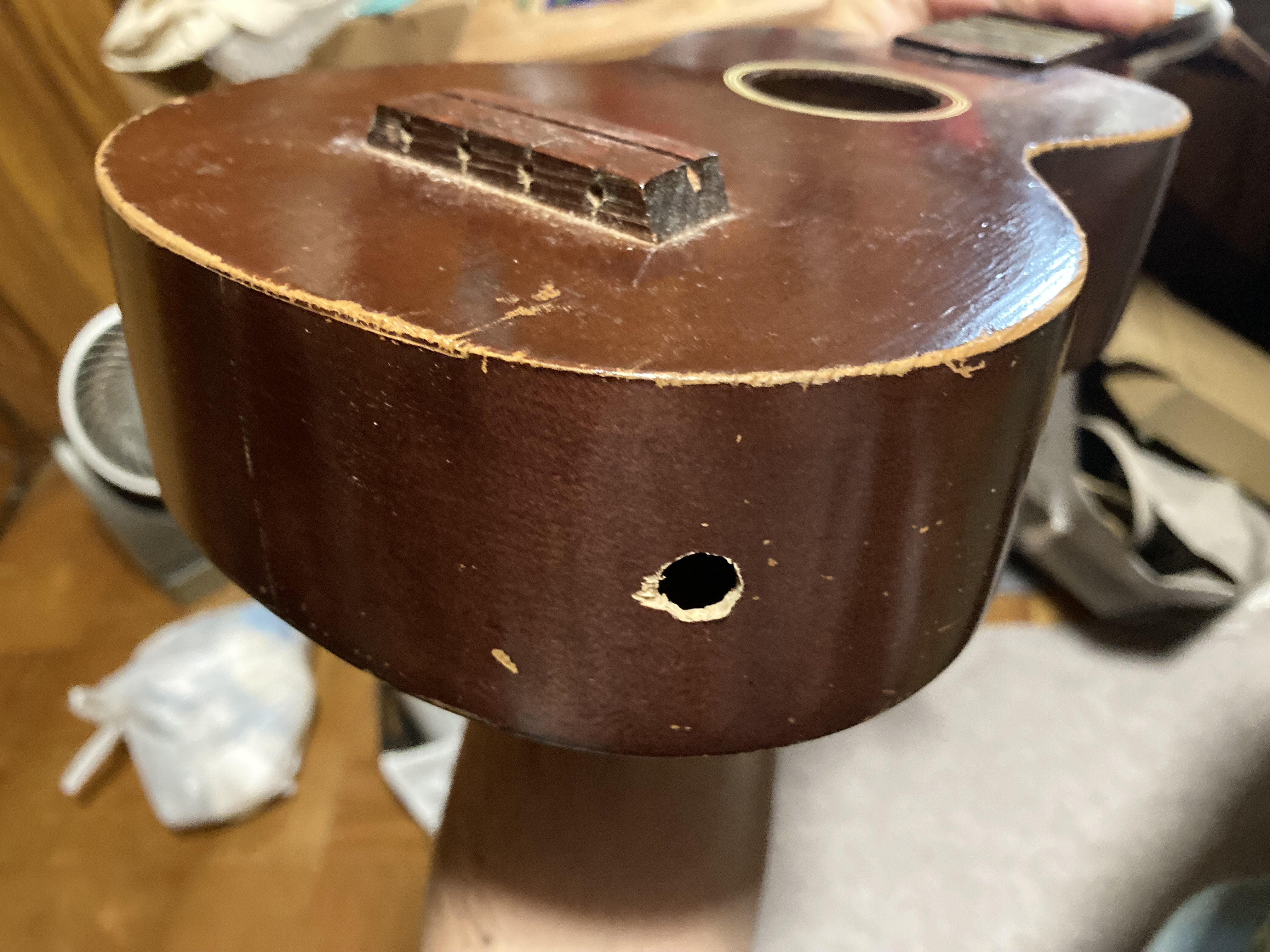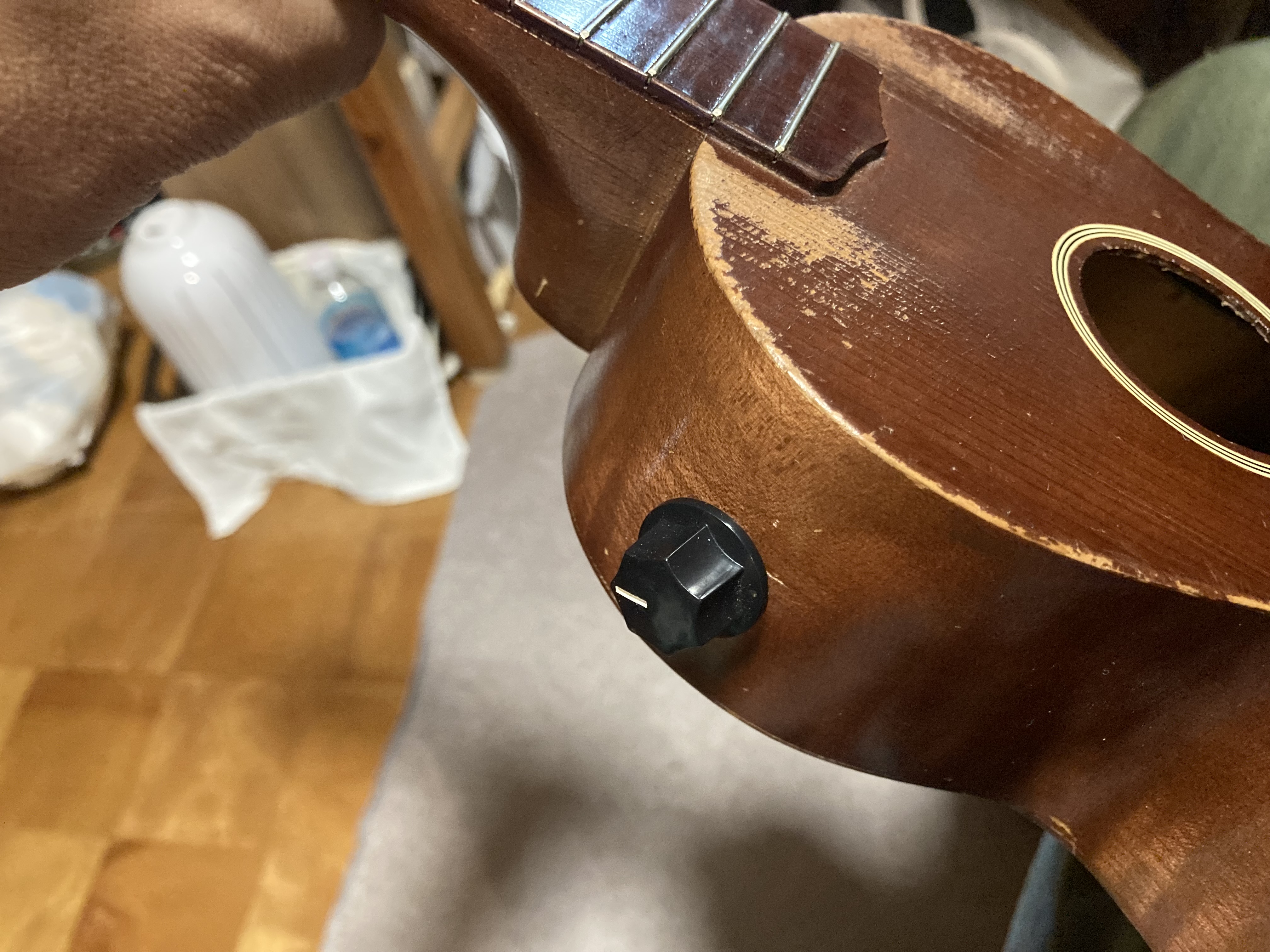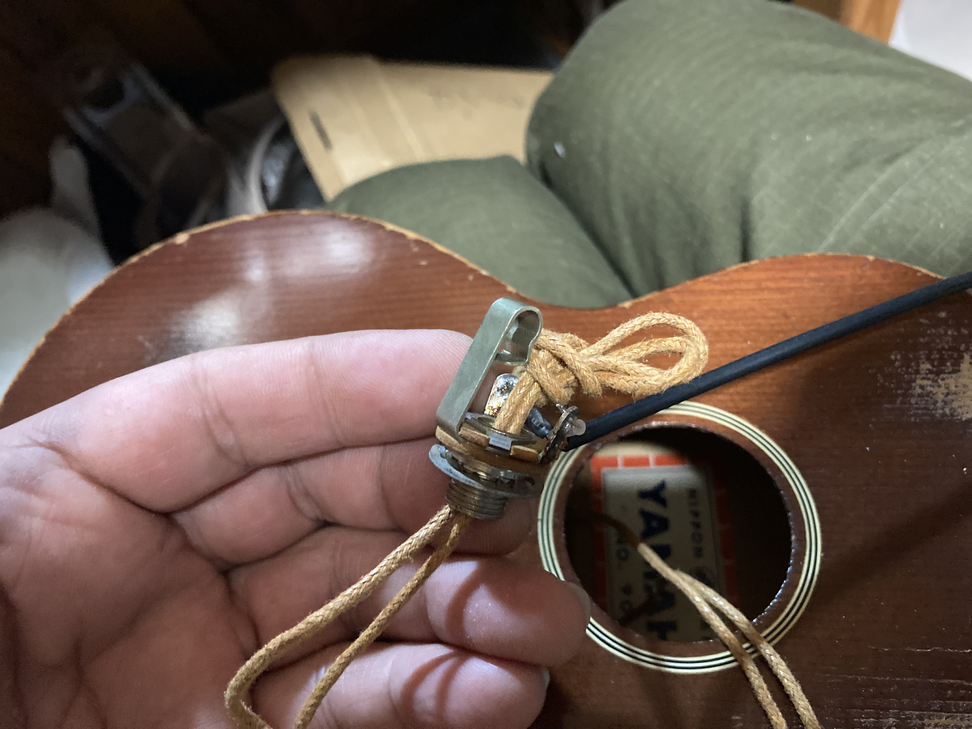 紐を適当な棒でつついて結び目を奥へ追いやり、後はサウンドホールから紐だけ取り出せば完了です。