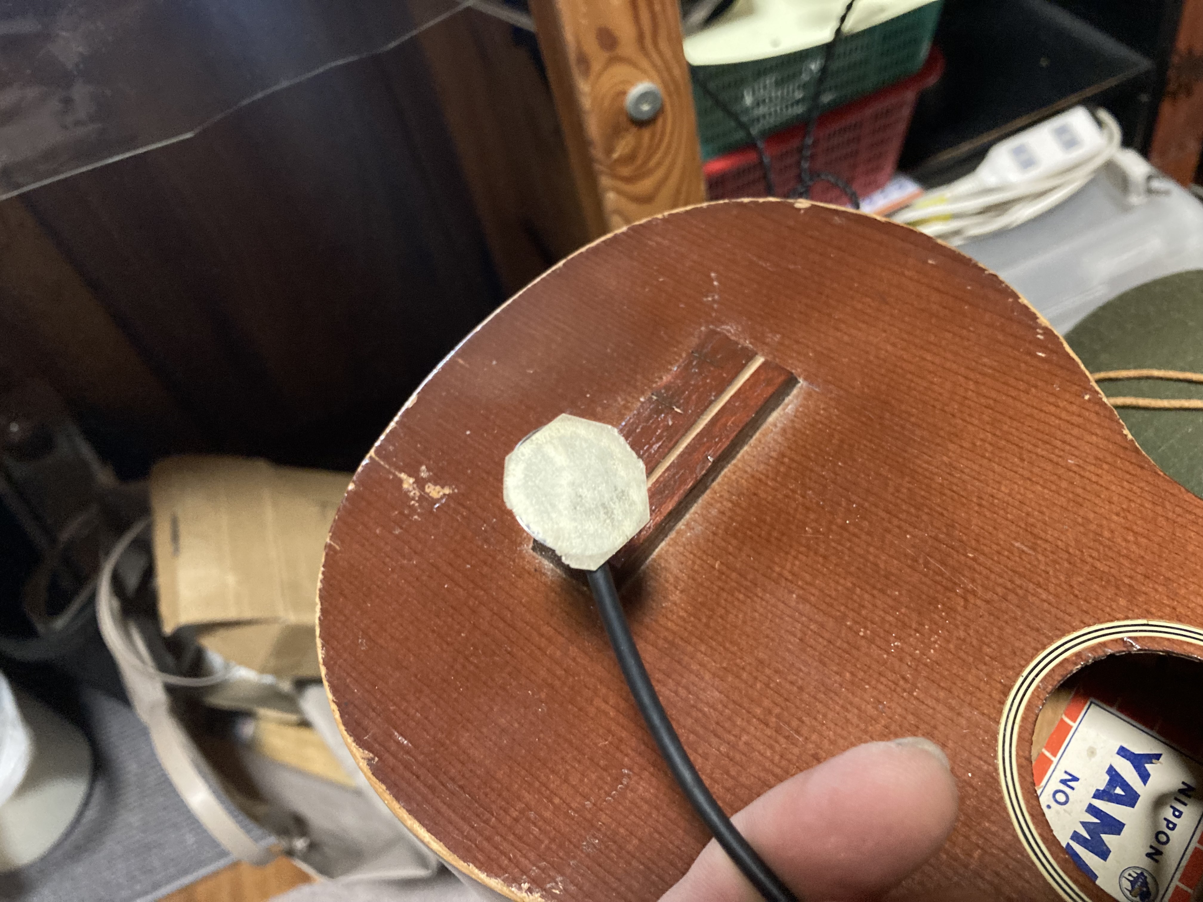 最後にピエゾに両面テープを貼り、指が届くギリギリの場所、ブリッジの脇あたりに貼り付けます。